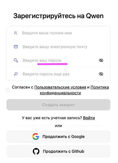 При регистрации в Qwen укажите: